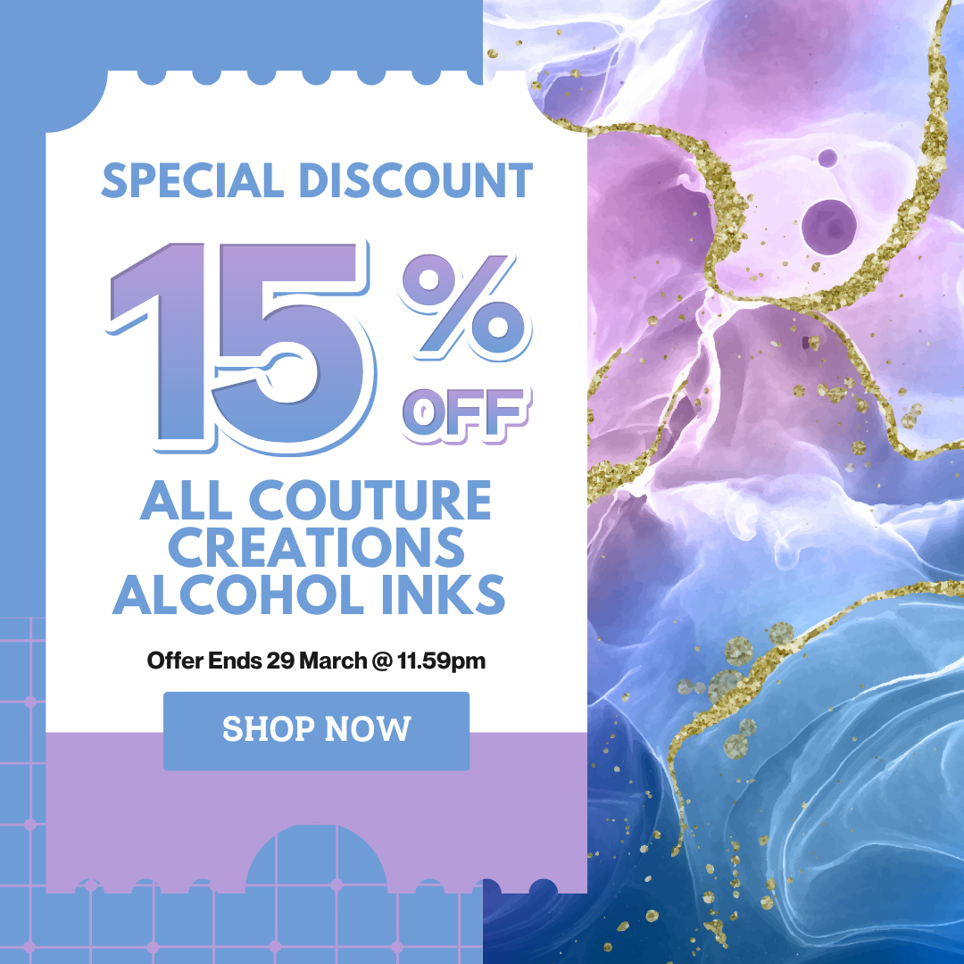 For a limited time, enjoy a 15% OFF discount on the entire range of Couture Creations Alcohol Inks. No codes, no fuss… the savings magically appear at checkout.