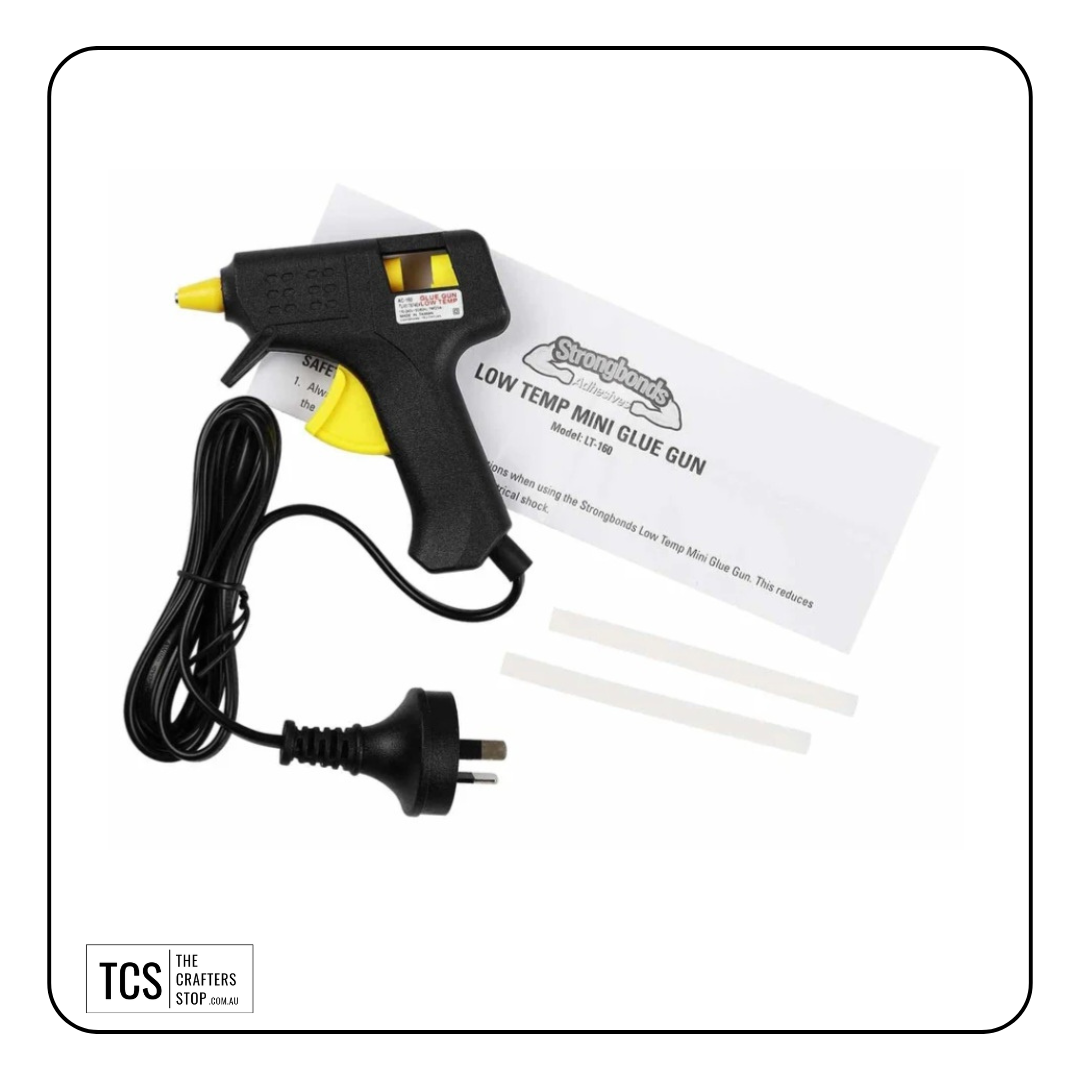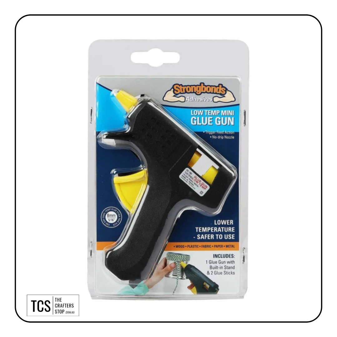 The Strongbonds Low Temp Mini Glue Gun is the safest mini glue gun on the market. Ideal for use with Strongbonds Glue Sticks, this mini glue gun has a lower temperature and no-drip nozzle, making it easy and safe to use. The simple trigger-feed action also ensures you can work easily and quickly with no fiddling around. Perfect for craft work, garment design, and even minor home repairs - this powerful little mini glue gun is ready for your crafting needs.