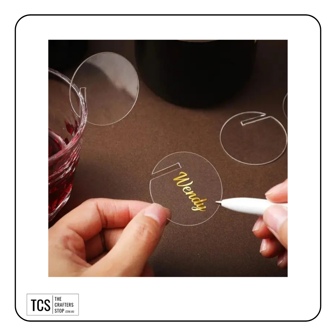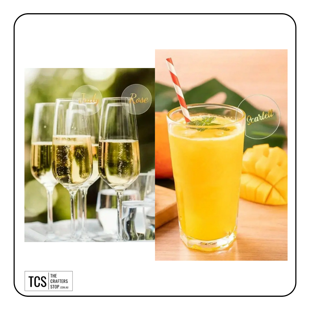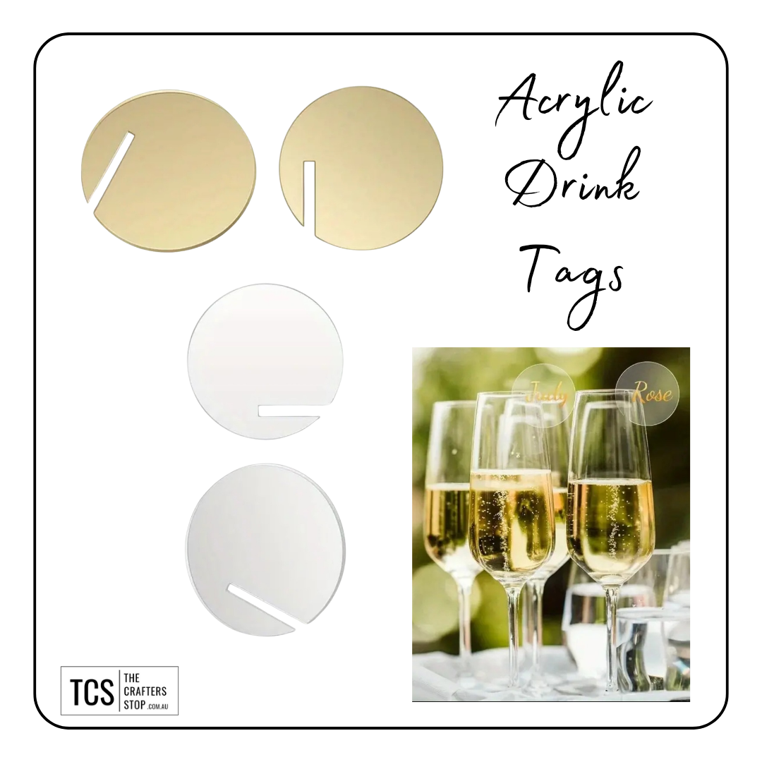 Make a number of personalised gifts with these round acrylic drink tags. Add a name or image and display on your glass so your quests will not misplace their drinks. Great for weddings or parties.