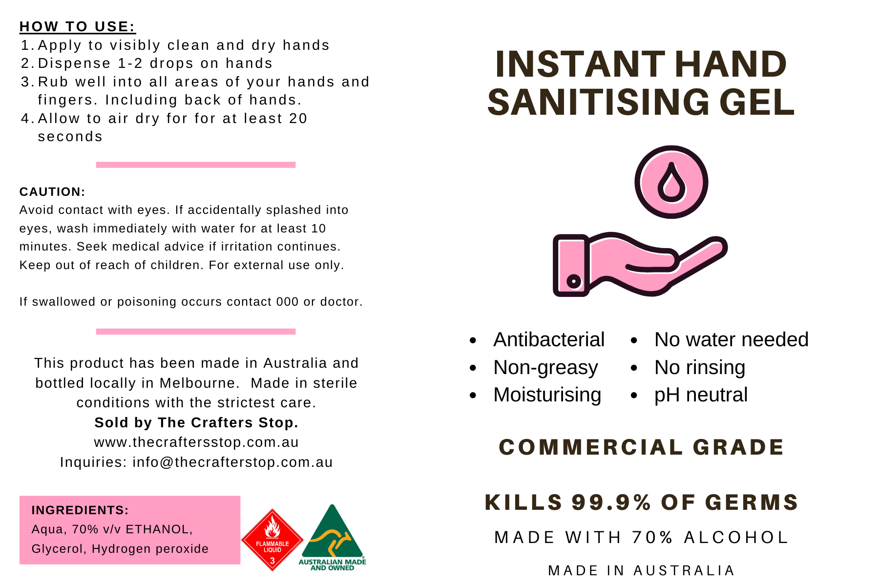 Disclaimer: Any hand sanitiser use (either non-alcohol or containing alcohol) is only an aid in preventing germs, the number one thing that will help you prevent germs is correct hand washing.