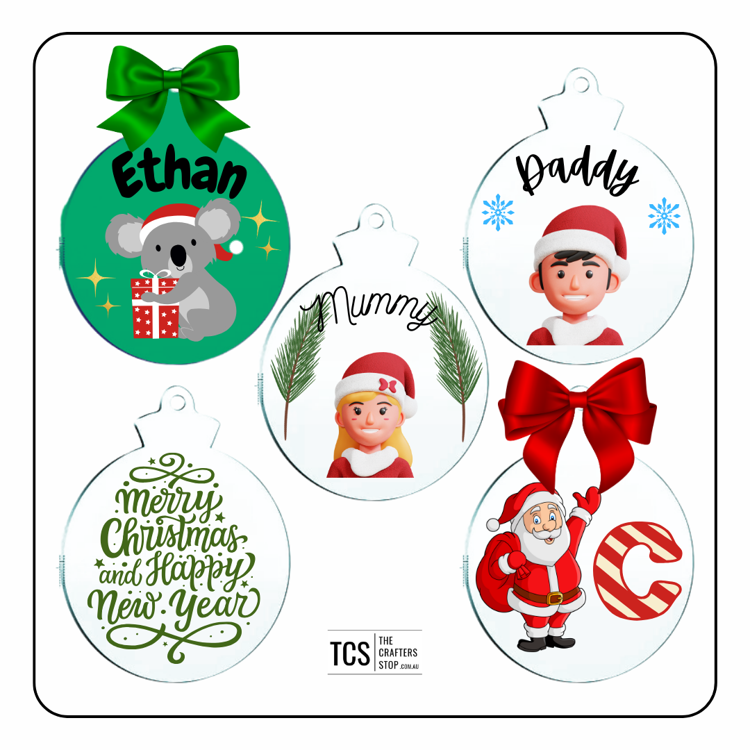 Make a number of personalised gifts with these cute round acrylic bauble blanks. Add a name or image and display on your Christmas tree.