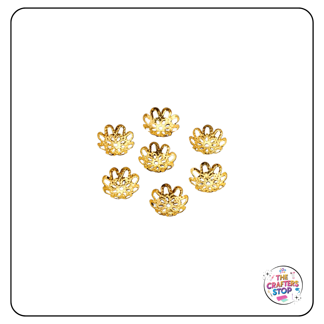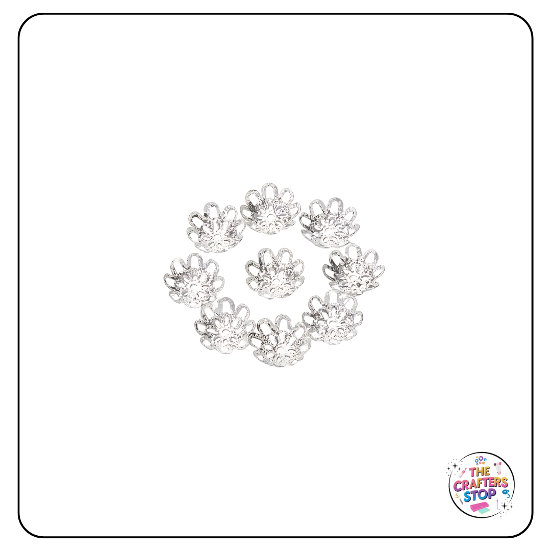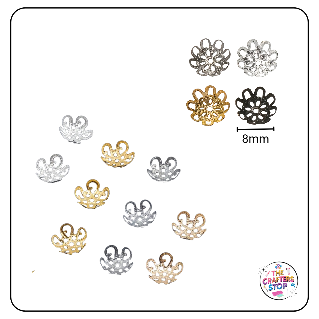 Add a touch of shine to your jewelry creations with these flower shaped bead caps. Simply place them between beads for a fun decorative touch. Let your designs sparkle with a bit of extra flair!