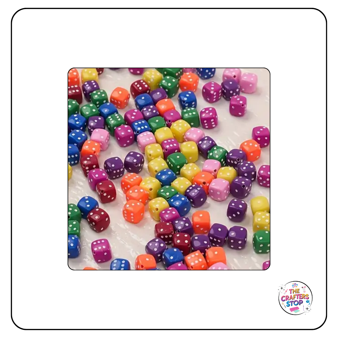 Roll with these quirky cube-shaped acrylic beads that bring a fun, geometric twist to your jewellery and craft projects. Each bead features a diagonal hole drilled corner-to-corner, creating an eye-catching 3D effect when strung. Available in classic white and black or vibrant colours to match your creative vision. Perfect for adding playful personality to bracelets, necklaces, and mixed-media designs.