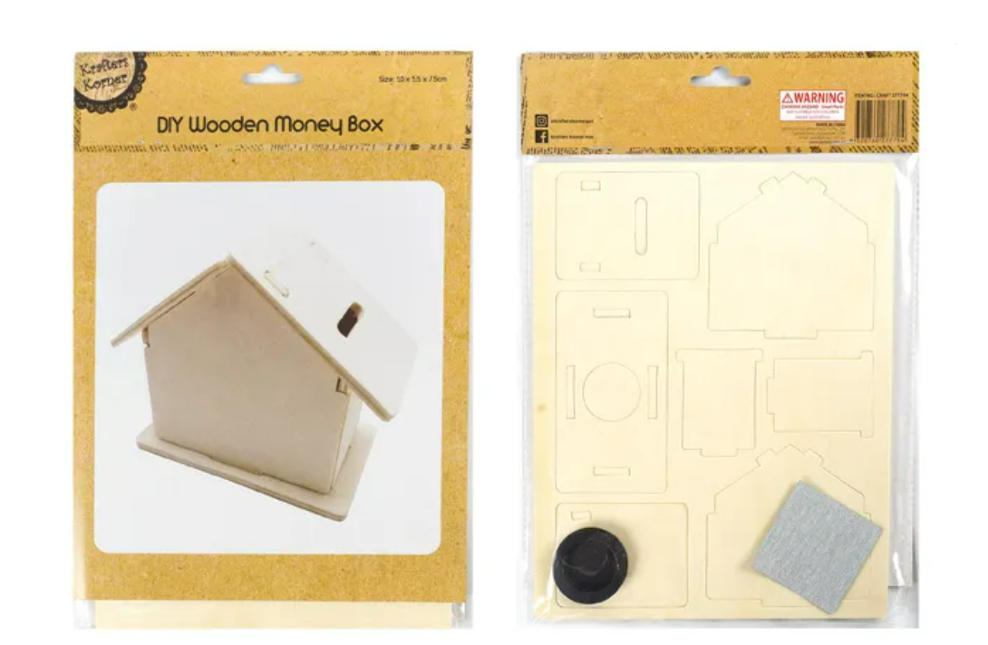 Make your own Wooden Money Box. Paint and decorate to your liking. Great for kids to save up for a special toy they like or a trip. The kids could even decorate there own.