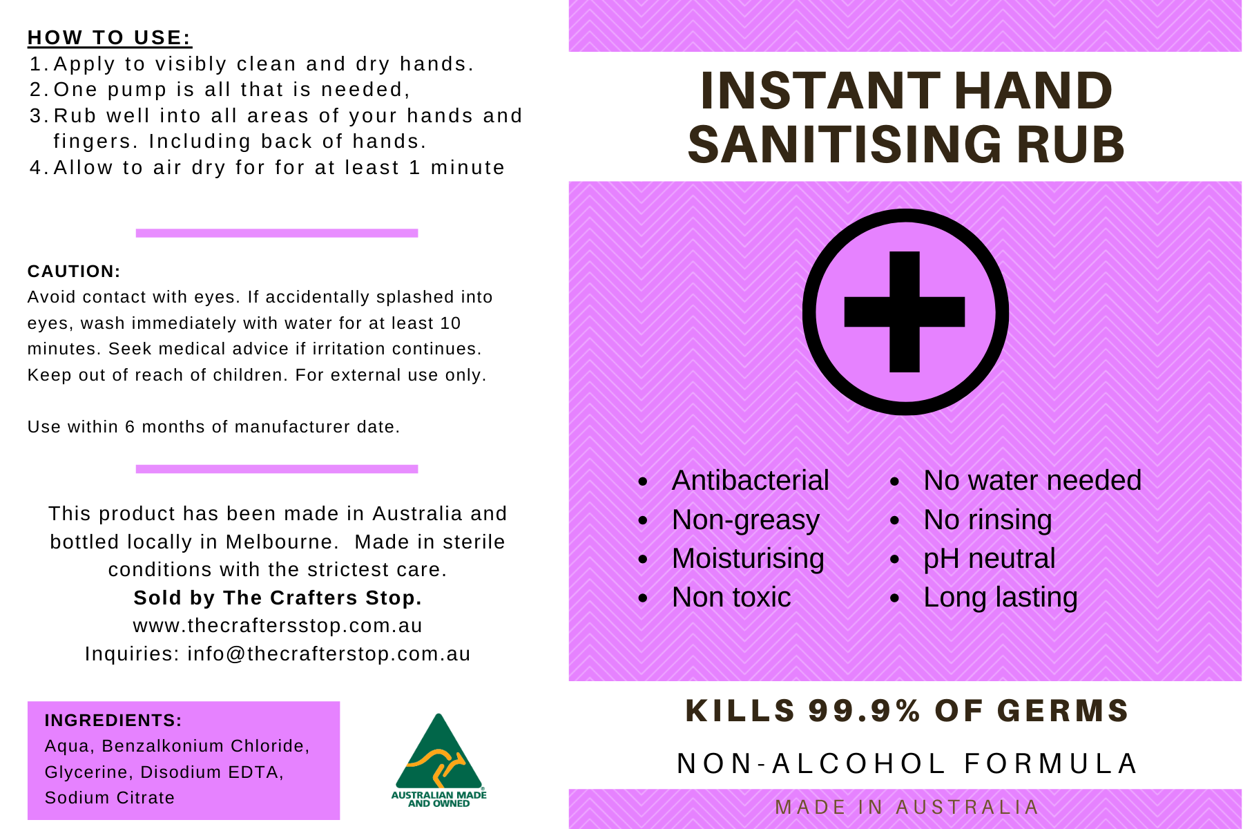 Disclaimer: Any hand sanitiser use (either non-alcohol or containing alcohol) is only an aid in preventing germs, the number one thing that will help you prevent germs is correct hand washing.