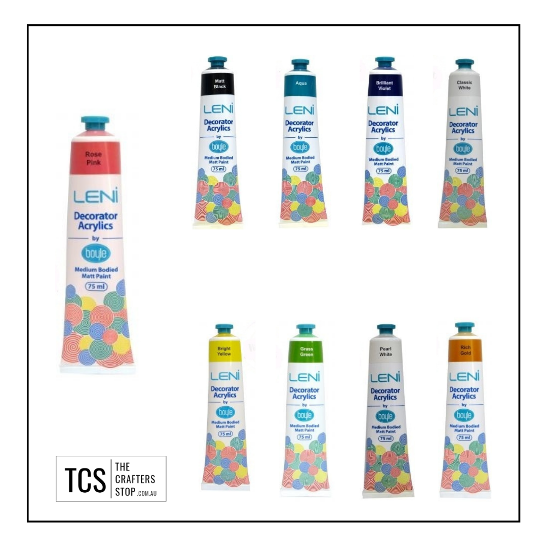 Leni Decorator Acrylics matt paint range offers medium body density for easy to use flow and colour coverage. Suitable on primed canvas, timber, MDF craft wood, paper and more. For use with decorating, arts, crafts and hobbies.