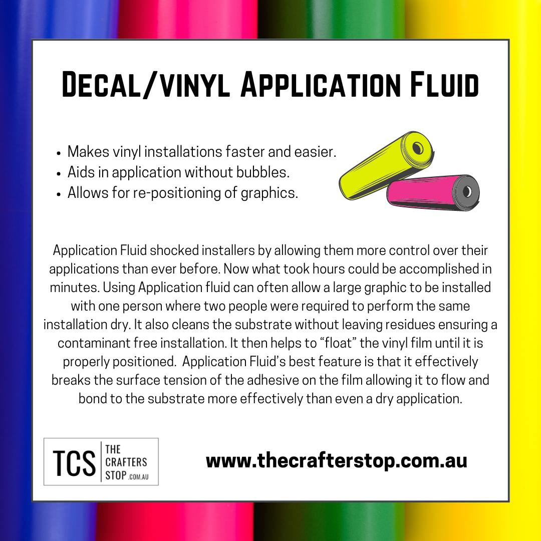 Anyone who uses adhesive vinyl and applies it to glass or mirror's etc know that we basically only have one go to get it right because it's hell to try and remove the vinyl if you have put it on crooked. Well that's where Vinyl Application Fluid comes in using the "wet method" of applying vinyl. It's a life saver.